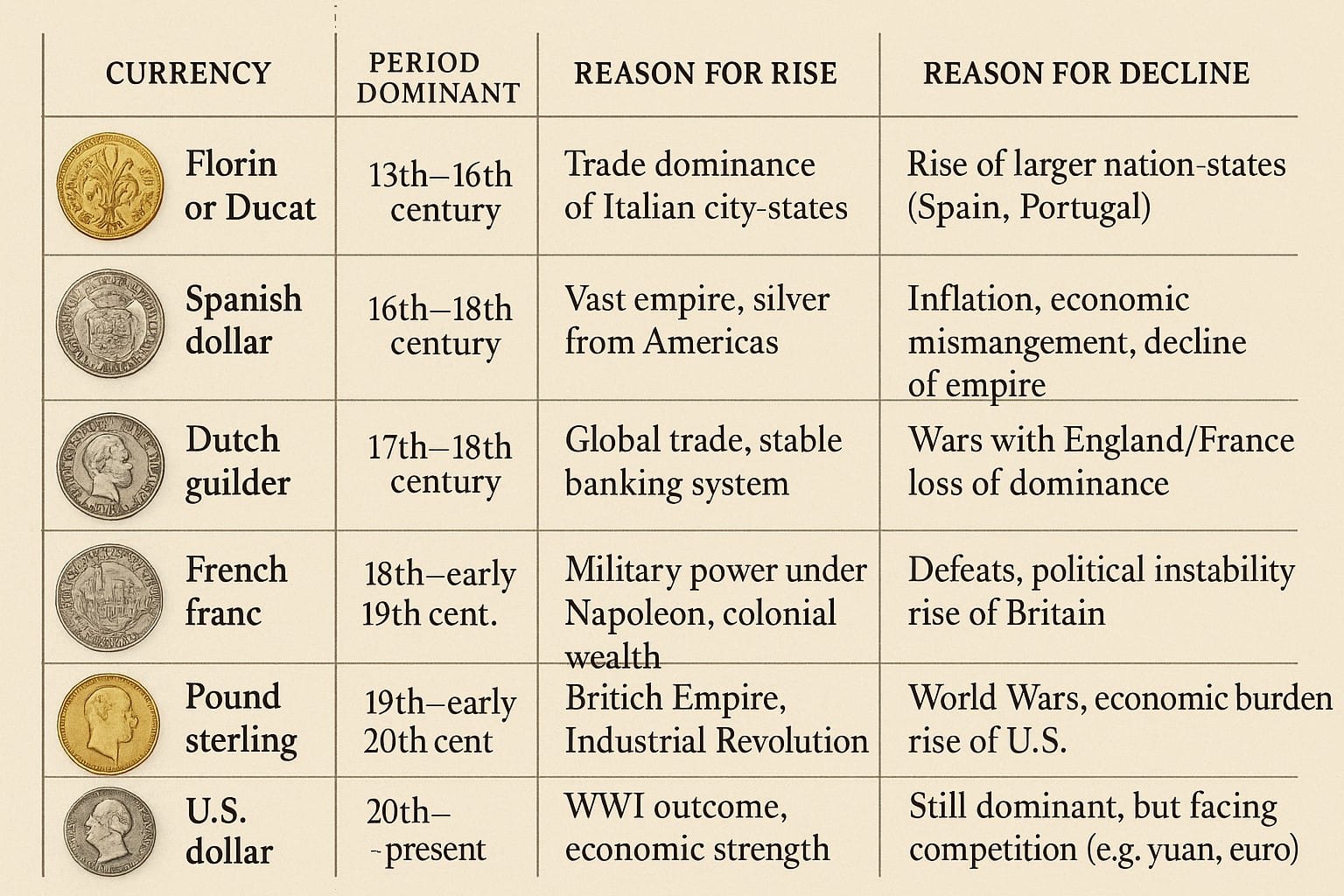 Above currencies where once backed by some of the strongest empires of the past. All these countries where biggest economies at one time ,but then they faced financial crisis where they printed large amount of money just to service the interest taken on debt and had to face an internal/external revolution and ultimately had to cede power to the next big empire.