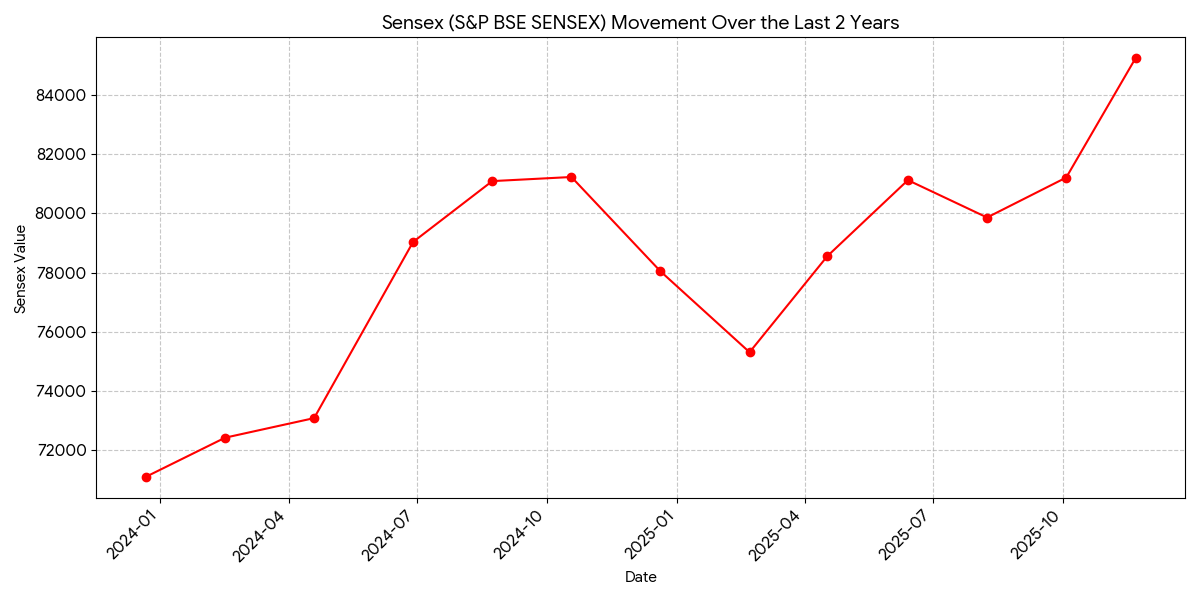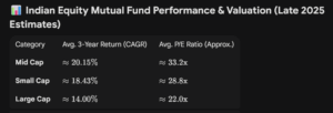 Above chart shows the movement of BSE benchmark Index SENSEX which has moved from 72000 in Dec 23 to 85000 in Nov. 25, giving a total absolute return of only 18% in these 2 years. The equity risk premium had become almost ZERO in this period. But the