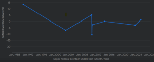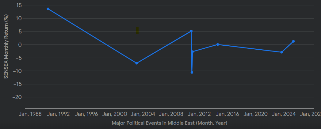 Above graph shows the SENSEX(Indian stock market benchmark Index) monthly returns during major political crisis in middles east for the past 30 years.